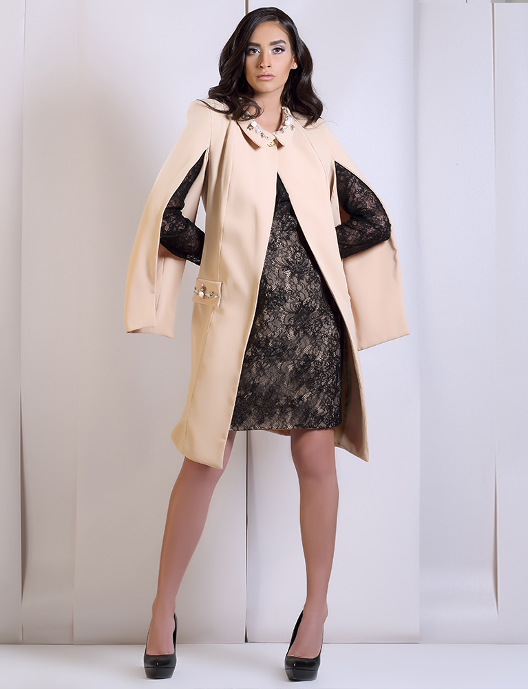 LACE MIDI DRESS IN BLACK, PAIRED WITH BEIGE WITH APPLIQUES LONG JACKET.