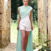 GREY BLOUSE IN CREPE GEORGETTE DECORATED WITH SILK THREAD, PAIRED WITH TROUSERS IN CREPE.