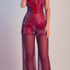 SILK SHIRT IN RED WITH A FLOWER, PAIRED WITH POINT D’ESPRIT LACE SKIRT.