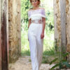 BEIGE ONE SHOULDER JUMPSUIT WITH OPEN SLITS LACE AND FLYING SILK, DECORATED WITH 3D AMARYLLIS FLOWER APPLIQUES.
