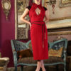 BLACK CREPE MIDI DRESS, DECORATED WITH 3D AMARYLLIS FLOWER APPLIQUES.